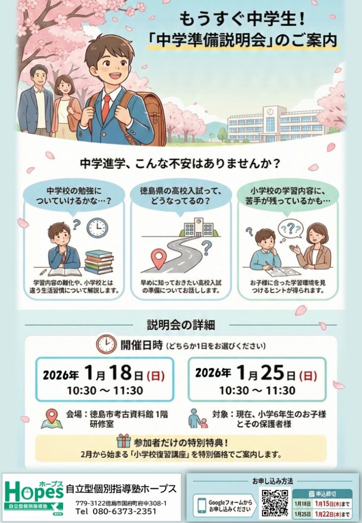 説明会にご参加いただいた方には、2月から実施する「小学校復習講座」を特別価格でご提供いたします。中学入学前に小学校の重要単元をしっかり復習できます。詳細は説明会にてご説明いたします。